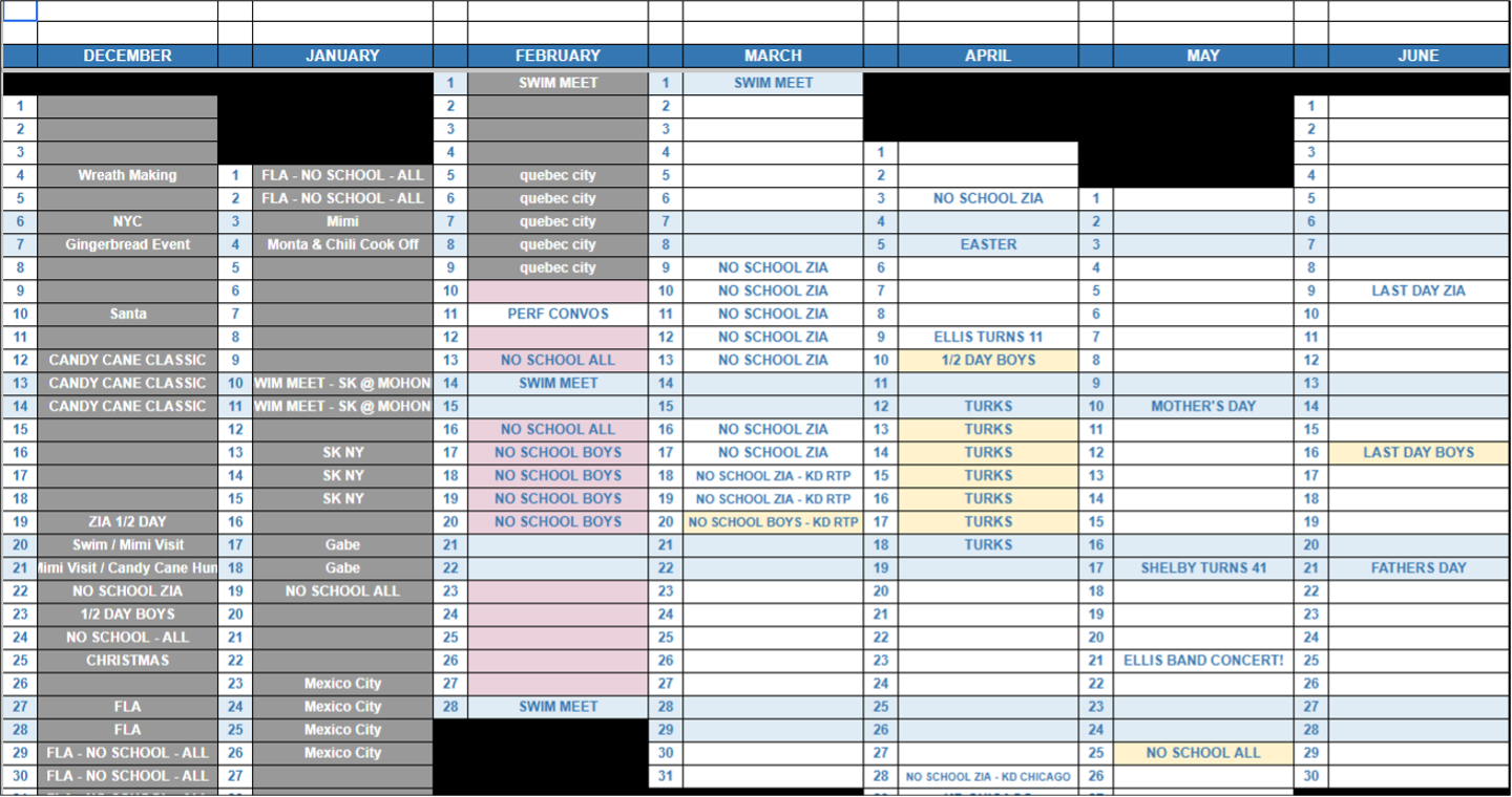 Then former Together Team Member Shelby Lee Keefer shared this amazing Google Sheet that she and her husband use. They are juggling three small kids, not to mention jobs and pets, and when I asked the why, Shelby said, “Using my week-by-week Google calendar, I would find that we would plan big events way too close together (overwhelming) or way too far apart (social desert). The Google digital calendar is still the source of truth, but the At-a-Glance calendar shows the shape of the month and the year. I use the format I made in excel to force me to just put big events – I don’t want to introduce more opportunities to conflict with the source of truth. Plus, I enjoy the color coding.”