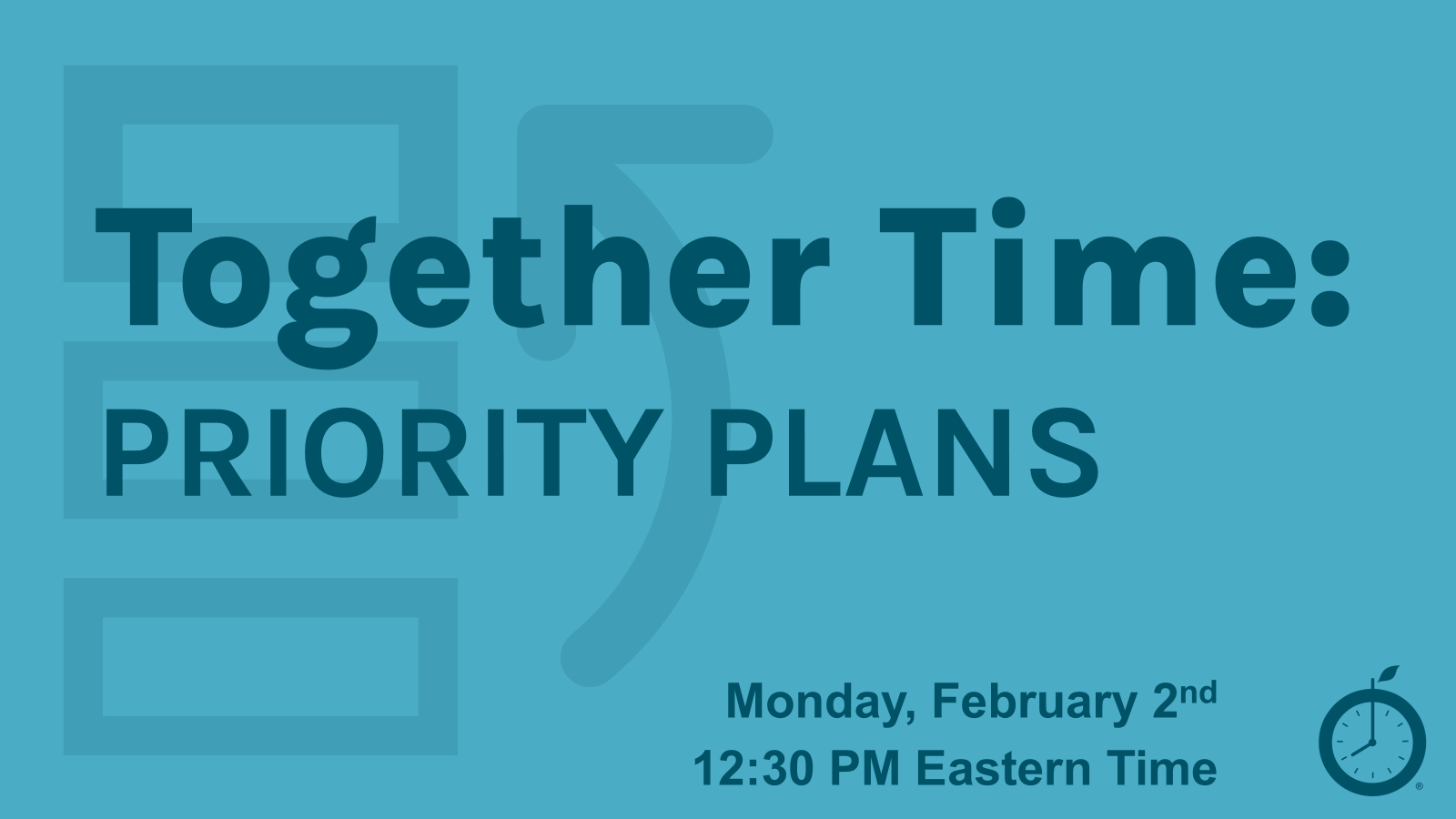 Planning is a key component to successful leadership. Being clear in your priorities allows you to focus on the right things at the right time, and identify tradeoffs so you can strategically pivot as needed. Join us to create a Priority Plan that communicates what matters most in the next three-month time period. Join us for Together Time: Priority Plans – a great sequel or prequel to The Together Leader!