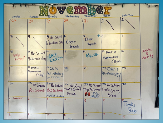 - Visual calendars posted in classrooms. Kids loved seeing a full month in Ms. Crowe’s math classroom. They said the reminders of assessments and assignments down the road helped them plan ahead.