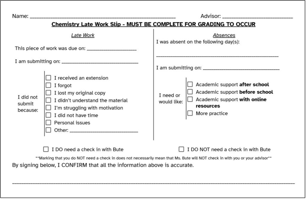 I teach two sections of chemistry and two sections of forensic science. And with my ADHD brain and the ups and downs of post-COVID student attendance, everything would get scrambled when students would hand me a piece of late work. Enter: The Chemistry Late Work slip!