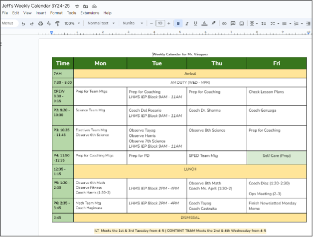 It all started in August with me making a calendar of my week on a Google Doc or spreadsheet that took a few iterations to get aligned with the school calendar and my teachers’ prep periods. Once the start of the school year got underway, I transferred my Google Doc into my Google Calendar that I check every afternoon or early morning and turn into a list of priorities that live in my notebook.