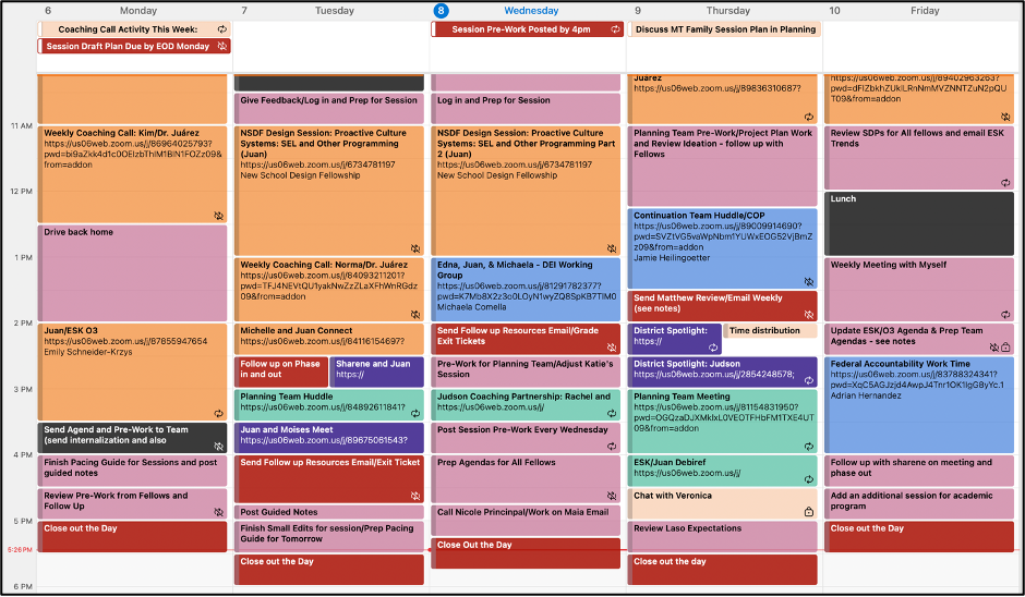 - Below is my calendar, which plays a vital role in my daily life. I rely on it to facilitate decision-making throughout my day and week. To enhance my time management, I use color-coding to categorize different types of meetings, planning sessions, and personal activities. The screenshot provided offers a glimpse into how I allocate my time.