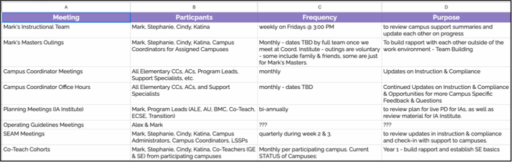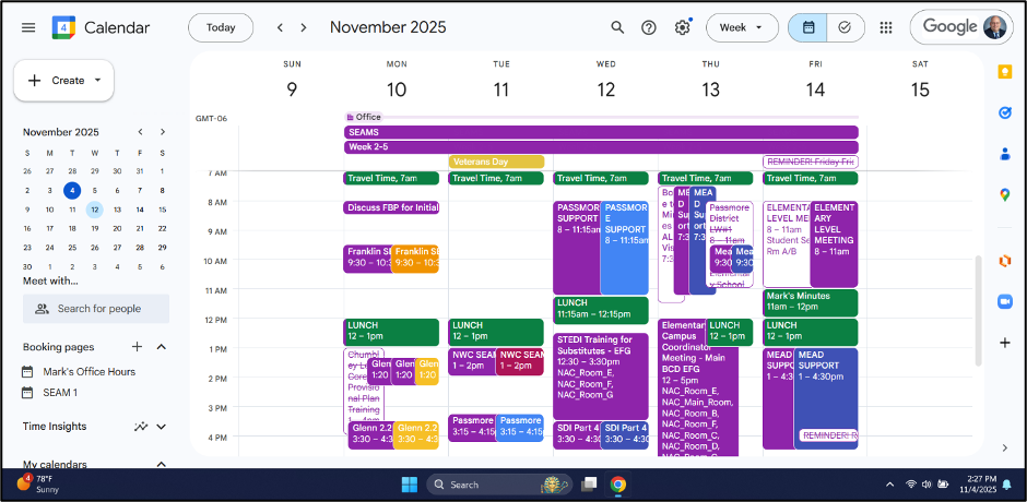 - Color-coding for clarity. My district-visible calendar has green (personal: travel, lunch, Mark’s Minutes) and purple (work meetings). I duplicate each meeting onto separate campus calendars with their own colors so I can instantly see which campus I’m supporting.