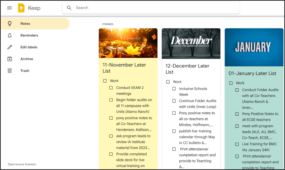 - Tab 2 – Monthly Task Map. Every task gets assigned to the months of the year—some monthly, some bi-monthly, some one-and-done. On this tab, I also link any documents I’ll need. From there I pull each month’s tasks into a Monthly Later List in Google Keep.