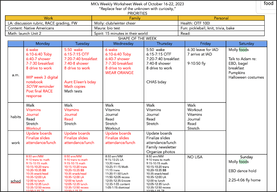 And, if I might add a third, the last is my Marriage Meeting – which my husband, Adam, leads. (Editor’s Note: We have discussed our own meeting here AND featured Bill and Katie’s Weekly Meeting. We also love the books Drop the Ball and Fair Play to help with the Chores part of what we call The Family Meeting.)