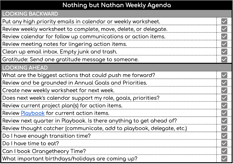 I have an agenda I borrowed from various examples in our class, and I have checkboxes for each step of my Nothing but Nathan Weekly Agenda.