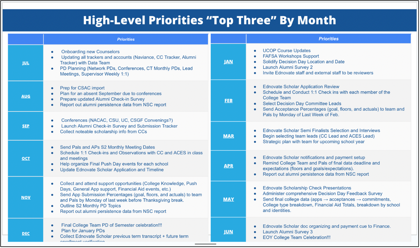 This month’s Together Tour features Nathan Olmeda-Lopez, the Director of College and Alumni Support for Ednovate. Nathan joined us for a recent Together Leader class, and of course, I’m obsessed with his role in working on college readiness and persistence (#togetherforcollege!). Nathan has a background in higher education, and he got pulled over to the world of K-12 because his now-husband was a teacher at Ednovate! As soon as I learned he was the first person in his role ever, I wanted to hear how he plans and manages his work.